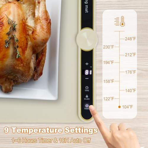 Precision Temperature Control: Electric warming tray featuring an easy-to-operate control panel with 9 adjustable heat settings ranging from 104°F to 248°F; Warming kitchen mat with state-of-the-art Electric heating technology for fast, even heating