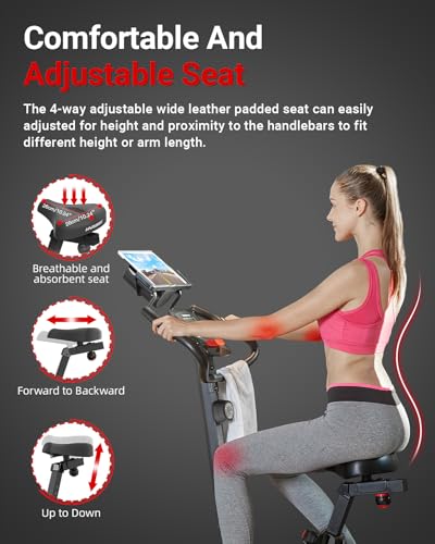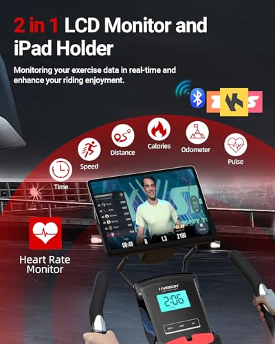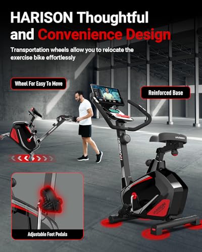 HARISON Stationary Bike with 2-in-1 LCD Monitor & Tablet Holder: Featuring a 2-in-1 LCD monitor, the bike for home is equipped with the latest technology that connects to compatible fitness apps. This innovative feature allows users to select cycling courses and synchronize their exercise data in real time, tracking key metrics such as time, calories burned, RPM, speed, and distance. Additionally, the integrated tablet holder lets you enjoy your favorite entertainment while you work out, making it easier and more enjoyable to stay committed to your fitness routine.