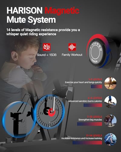 HARISON Exercise Bike with Advanced Magnetic Mute System: HARISON HR-B7 exercise bike features a state-of-the-art magnetic resistance system with 14 adjustable levels, providing an ultra-quiet and smooth riding experience suitable for all fitness levels—from beginners to advanced athletes. Easily customize your workout intensity to match your personal fitness goals, guaranteeing a challenging yet enjoyable ride for everyone. Whether you’re focused on rehabilitation, calorie burning, or high-intensity training, this indoor cycling bike is the perfect solution for all your fitness needs.